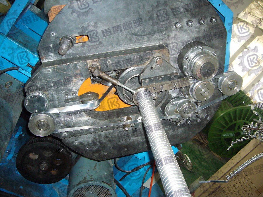 4.2.5?主機的中心裝有兩根不銹鋼中心管一根與主軸連接在一起,起到輸送鋁帶作用。另一根內(nèi)中心管固定不轉(zhuǎn),為避免電纜線在鎧裝過程中擦傷,設(shè)備在進線端裝有聚四氟材料的定位模塊,用于保護和固定電纜線。