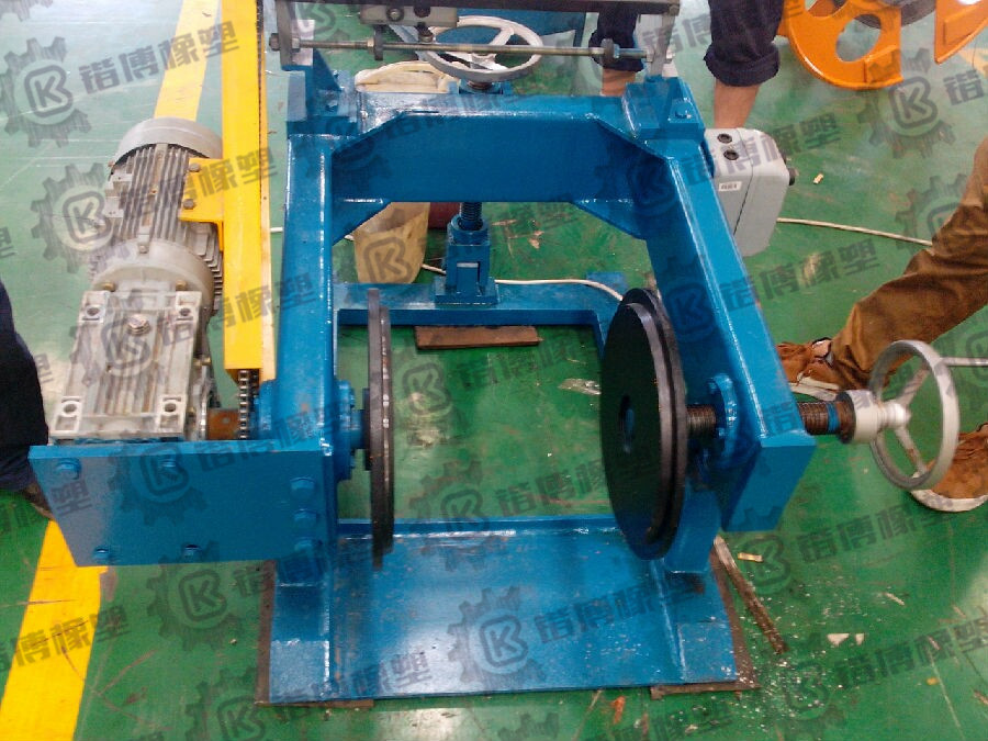 4.3.1?整機主框架為鋼板和型材焊接而成,通過一個伺服電機直聯(lián)蝸桿減速機帶動一對嚙合齒輪,以保證上下牽引輪同步轉(zhuǎn)動,每個牽引輪各帶動一條平皮帶傳動。上下有五對氣缸驅(qū)動壓緊裝置滾輪,使平皮帶壓緊電纜。平皮帶間距隨電纜直徑的不同而隨時變動,對于任何外徑的電纜,其中心高度不變。由氣動系統(tǒng)均勻的調(diào)整夾緊壓力和控制上下氣缸的氣源。有一單獨氣缸用來調(diào)節(jié)上下平皮帶張緊力。牽引裝置兩端均有井式導線裝置,以保證電纜中心位置不變。帶電子計米。